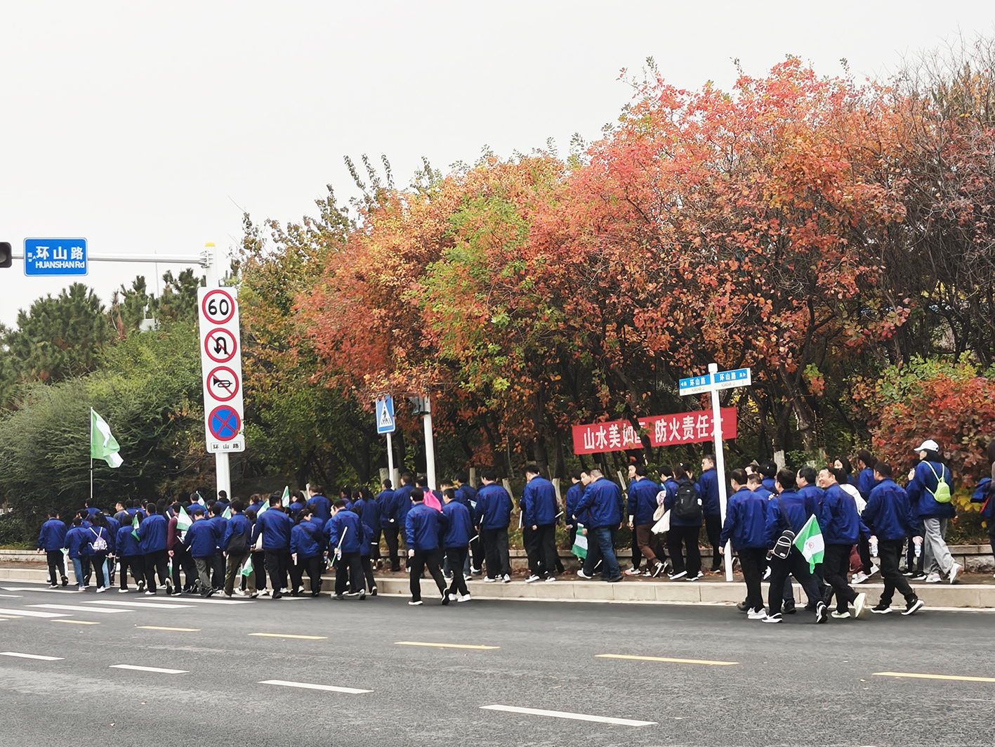 隨著清脆的發(fā)令槍響,徒步行正式開(kāi)始。在旗手的引領(lǐng)下,大家揮舞著旗幟,熱情滿滿,沿著既定路線健步向前。初冬的泰山,層林盡染,群峰如畫(huà)。